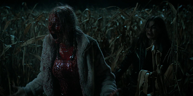La historia de la novela se enlaza directamente con los mapas conceptuales del ‹slasher› clásico, y esa es la marca a seguir por parte de esta adaptación. La adolescente Quinn y su padre se mudan a la pequeña localidad de Kettle Springs con la esperanza de dejar atrás un pasado reciente un tanto oscuro. Lo que se encuentran es una pequeña región asolada por una crisis económica auspiciada por el cierre de la fábrica de sirope de maíz, principal motor financiero de la localidad, con una comunidad fracturada y un devenir un tanto confuso; la crisis se acentúa cuando comienza a sucederse en el pueblo una oleada de crímenes, saliendo a la luz una figura anónima vestida de payaso que parece tener su origen en los campos de maíz; su vestimenta está heredada de Frendo, la antigua mascota de la mencionada fábrica. Teniendo en cuenta este argumento, no es difícil adivinar que Eli Craig plantea un tejido conceptual que hereda los estamentos argumentales y tonales del ‹slasher› más clásico, reformulando los espacios comunes que el aficionado más experimentado ya habrá visitado previamente con los clásicos de décadas pasadas. No es difícil sentir efluvios de cintas como La noche de Halloween o Viernes 13, por citar las referencias más evidentes, en la manera que Cosecha sangrienta trae a la actualidad ítems tan reconocibles como el villano anónimo con indumentaria característica, procurando un carisma escénico bajo la pretensión de convertirlo en miembro del ‹star system› del terror. En su fórmula de retrotraer al fan a tiempos pasados, tampoco falta el grupo de arquetípicos adolescentes carnaza de homicidio, o su ‹final girl› con un arco propio de personaje. No obstante, donde la cinta de Craig sale mejor parada es en su intento de plasmación de la típica comunidad norteamericana decadente y depresiva, campo de acción rico en texturas para este tipo de tramas, a la que da una naturalidad tonal que va mucho más allá del mero escenario para el ‹body count›; su dramatización en un entorno rural aislado nos permite también el sentir la vuelta a un horror más propio de aquellos ‹slashers› germinales urdidos en los locos años 70.