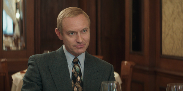De entrada, y para evitar sorpresas, resulta necesario señalar que la película está íntegramente hablada en inglés. Independientemente de la burda costumbre de resignificar cualquier relato a los modelos y estándares hollywoodenses, esto puede encontrar su justificación por cómo quiere ser narrada esta historia. Pero, por si fuera poco, también sería conveniente destacar que se trata de la adaptación de una novela del ensayista francés Giuliano da Empoli —de ahí que la producción cinematográfica corriera a cargo de Olivier Assayas—. Partiendo de estos parámetros, es interesante comprobar cómo el escritor y el director resguardan su posición y se acercan a una realidad ajena mediante el personaje de Rowland (Jeffrey Wright): un periodista extranjero que visita a Baranov y le pregunta por su pasado en una entrevista que es expuesta mediante una continua voz en ‹off› y numerosos ‹flashbacks› donde se desarrolla toda lo sucedido previo a ese encuentro. Es decir, lo que es mostrado en imágenes a partir de entonces proviene de la recreación de una conversación, de los recuerdos y la interpretación de un testigo que, con el pasar de los años, se convierte en un sujeto activo de la mentalidad y transformación de un país entero. Por ende, el cómputo total adquiere un valor representativo, cercano a lo teatral; un elemento que también tiene importancia en la identidad formal y política del filme.